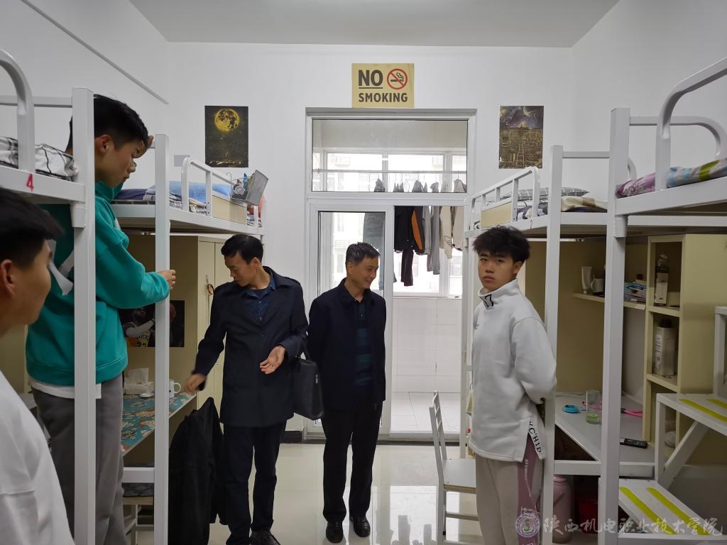 在学生宿舍,各位领导对学生的住宿环境、内务卫生、安全保障等进行了细致的检查,与同学们进行了亲切的交流,听取了同学们对宿舍和生活设施的意见,询问了学习、生活情况,了解学生思想动态,并对学生宿舍环境卫生、宿舍文化建设、宿舍学风建设等进行了现场指导。同时叮嘱同学们在平常的生活中,要严格遵守学校和公寓管理规定,务必注意财物安全、用水用电安全、人身安全,加强内务清理管理,保持宿舍环境卫生,主动打扫宿舍卫生并将垃圾随手携带出宿舍楼扔在规定的垃圾存放区域;勉励同学们勤奋学习、努力向上,培养良好的生活习惯,营造良好的学习氛围,做一位文明的大学生,为今后更好地适应社会打下坚实基础。